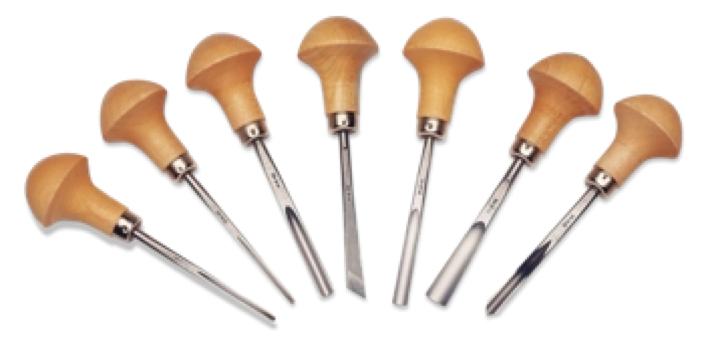 Als Werkzeuge dienen verschiedene Schneideklingen: ein Konturmesser, ein Geißfuß (v-förmige Klinge) und drei Hohleisen (Rundmesser, u-förmige, 2, 3 oder 4 mm breite Klinge).